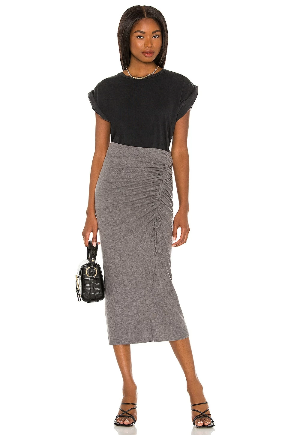 SKU: Midi SOSR-WQ43 Categories: Midi, Skirts Tags: Bodycon Skirts, Gray, Grey Skirts, Matching Separates, Midi Skirts, Ruching, Slits